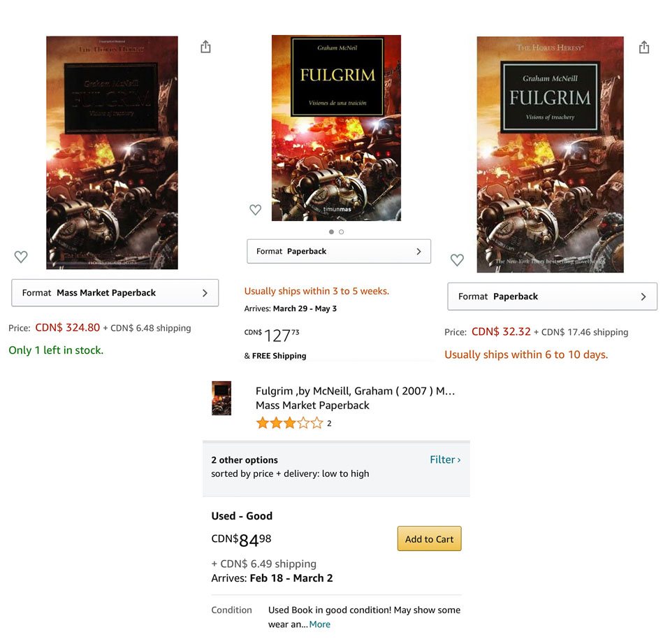 I am pro free market, but these prices were way too insane for me not to write about it. I am still waiting for the book #5 and #6 from the Horus Heresy saga to be back in stock at Black Library or… sold by Amazon.